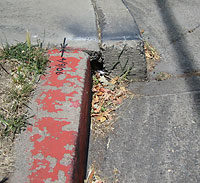 The fault separates land that is moving in opposite directions. Evidence of this movement can be seen nearby. Notice the displaced curb in the picture below. The displacement occurred because the sidewalk slabs have been moving opposite directions for a few years. This movement also causes streets to crack, requiring frequent road work along the fault.