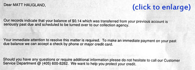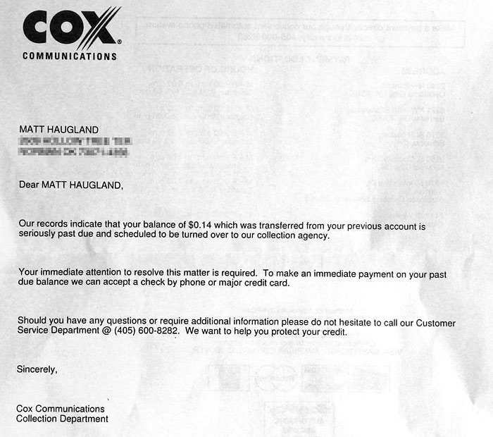 Today I received a notice from Cox saying that my account is "seriously past due" and scheduled to be turned over to their collection agency. The amount I owe... 14 cents!!!!
